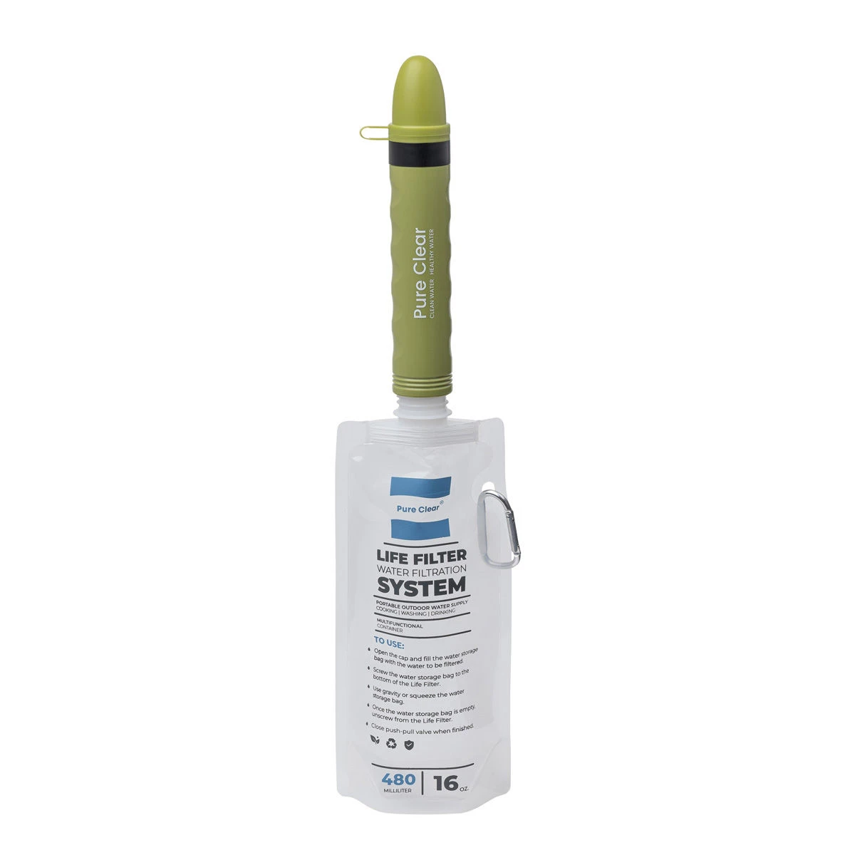 This system comes complete with the Life Filter®, 2 x Life Filter® Pouches, an extended 82 cm drinking tube, life Filter Bag and 2 x mini carabiners.